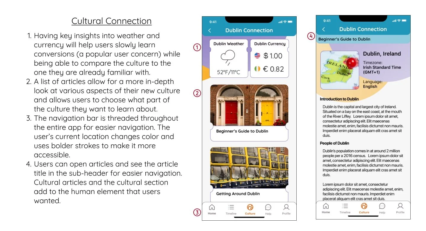 While we can’t change the actual process, we can change how users approach it. By creating a step-by-step process, tailored to the specific user’s circumstances, I was able to eliminate a lot of the friction felt by users. The timeline keeps users organized and on track. The help section guides users through uncertainty. The culture connection helps eliminate some of the concern over culture shock.