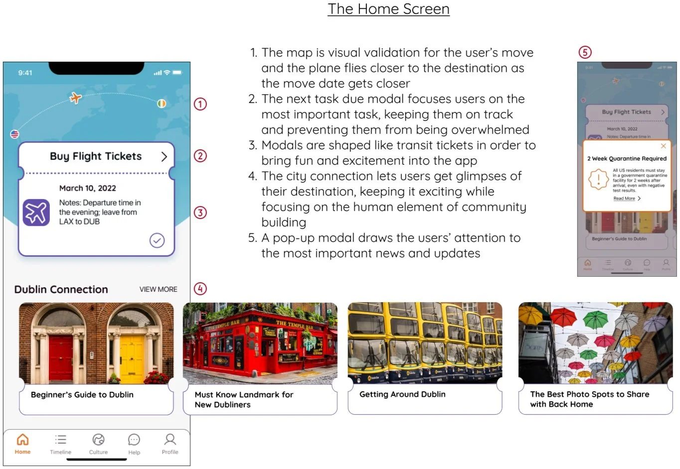 I also made sure to include aspects that will excite users about their move. Users have the ability to explore the culture from the comfort of their couch. Design details, such as ticket shaped modals and the home page map, are meant to engage users in their move.